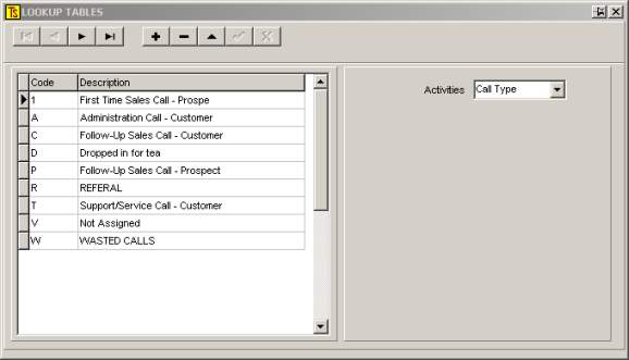 This screen differs from the normal Customer Maintenance screen found at [Customer][Maintenance] in that it has two new buttons, namely [Lookup Table] , [Activities] and [Follow up’s] We will deal with each of these in turn. Lookup Table If you select [Lookup Table] you will see a screen similar to this: