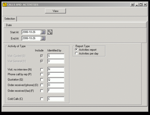 The selections are self-evident. The report is very useful in that, at the end of each rep’s report it gives the total number of accounts (cold calls) made during the selected time period, the number of visits made to these accounts over the period, the number of contacts with the customer and the total monetary value for the sales made to these customers. This is a very useful report to determine the relative efficiencies of your sales people. The